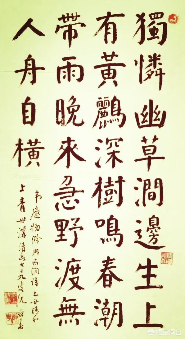 今天看到是沈觐寿七十九岁时创作的颜体楷书作品,写的是韦应物的一首诗,正文书体为楷书,传统元素的支撑来自颜真卿楷书《麻姑仙坛记》,落款为行书王蔚松。这幅作品用笔老辣,结构优美,章法布局和谐优秀,技术含量高,生命力强,艺术观赏性强,真正达到了炉火纯青的境地,是不可多得的颜体楷书精品力作。